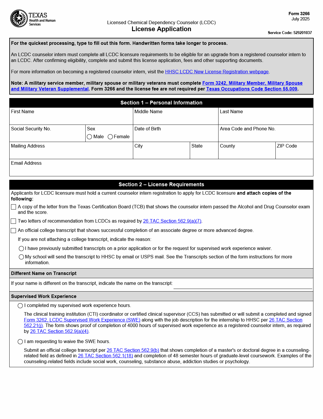 TX HHS Form 3266. Licensed Chemical Dependency Counselor (LCDC) License Application