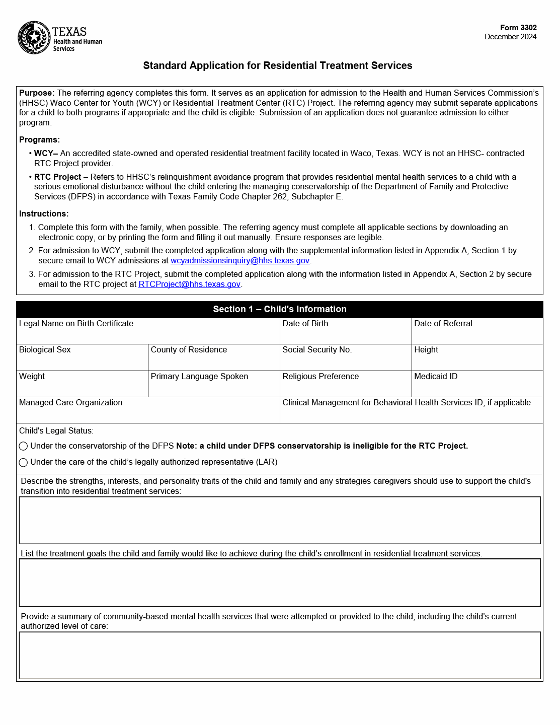 The TX HHS Form 3302, Standard Application for Residential Treatment Services, is a crucial document used to apply for admission to the Health and Human Services Commission's Waco Center for Youth (WCY) or Residential Treatment Center (RTC) Project. This form serves as an application for residential treatment services, providing essential information about the child seeking admission.