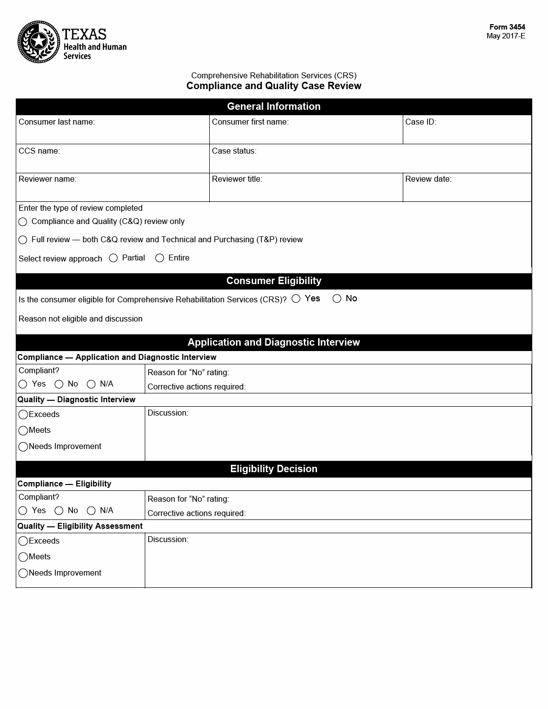 The TX HHS Form 3454, Compliance and Quality Case Review, is a tool used to assess the eligibility of consumers for Comprehensive Rehabilitation Services (CRS). This form helps ensure that individuals receive the necessary services by reviewing their application and diagnostic interview.