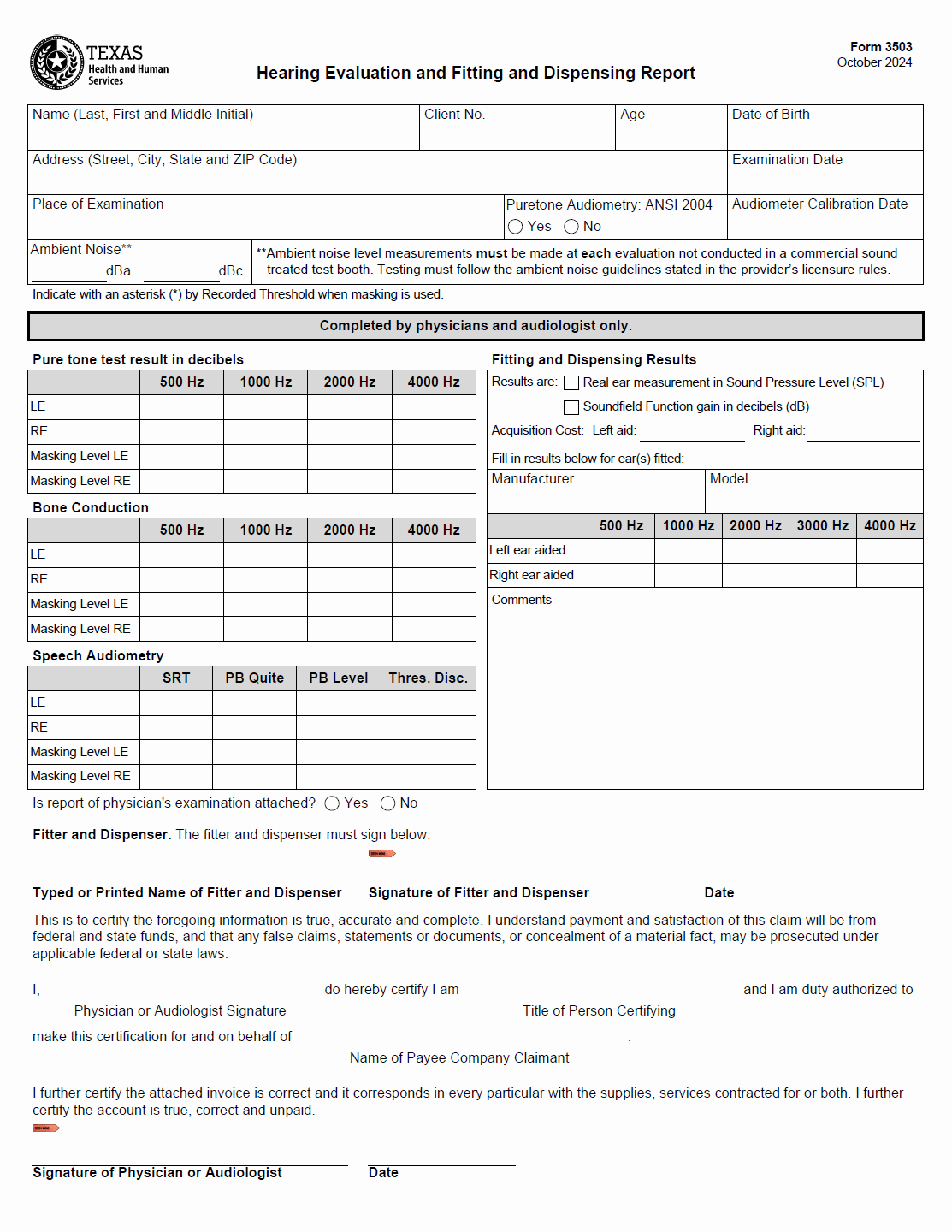 TX HHS Form 3503. Hearing Evaluation and Fitting and Dispensing Report