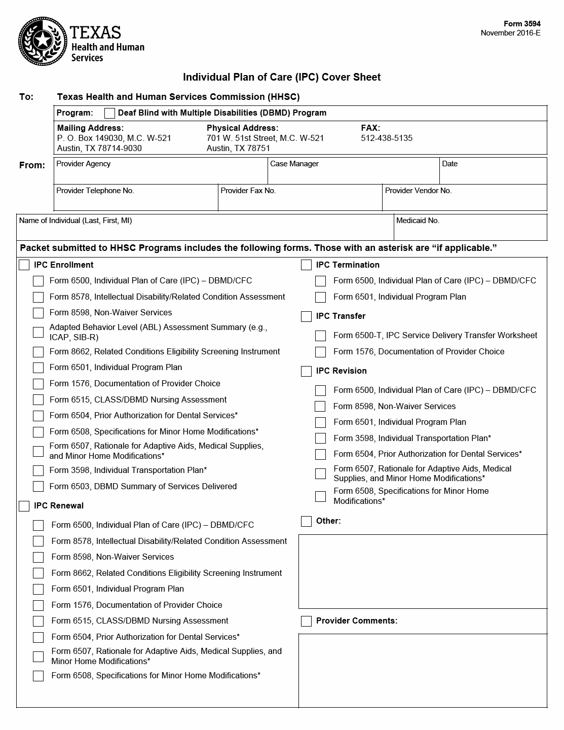 TX HHS Form 3594. Individual Plan of Care (IPC) Cover Sheet