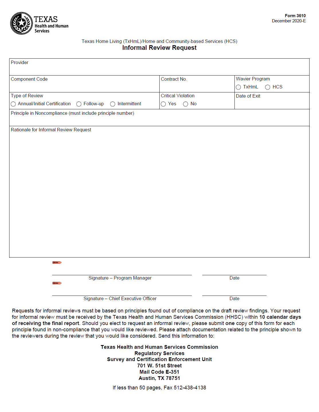 This form should be used when a stakeholder wants to request an informal review of draft findings that identify principles out of compliance. The form can be submitted to Texas Health and Human Services Commission Regulatory Services Survey and Certification Enforcement Unit at 701 W. 51st Street, Mail Code E-351, Austin, TX 78751. If the submission is less than 50 pages, it can also be faxed to 512-438-4138.