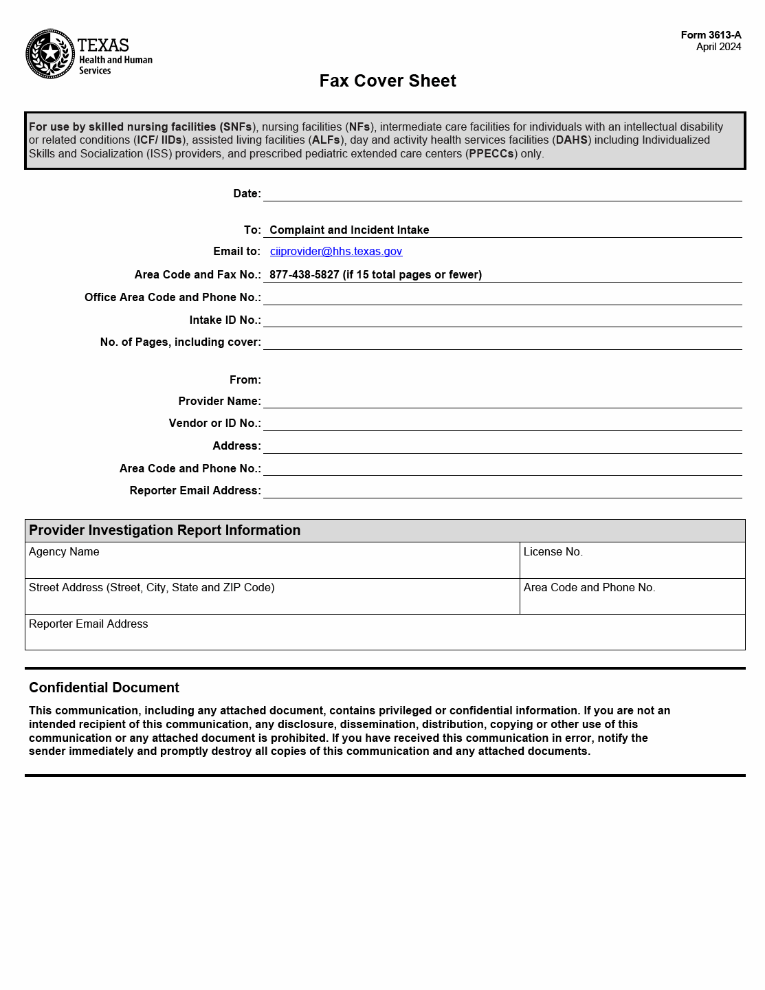 TX HHS Form 3613-A. SNF. NF. ICF/IID. ALF. DAHS including ISS providers and PPECC Provider Investigation Report with Cover Sheet