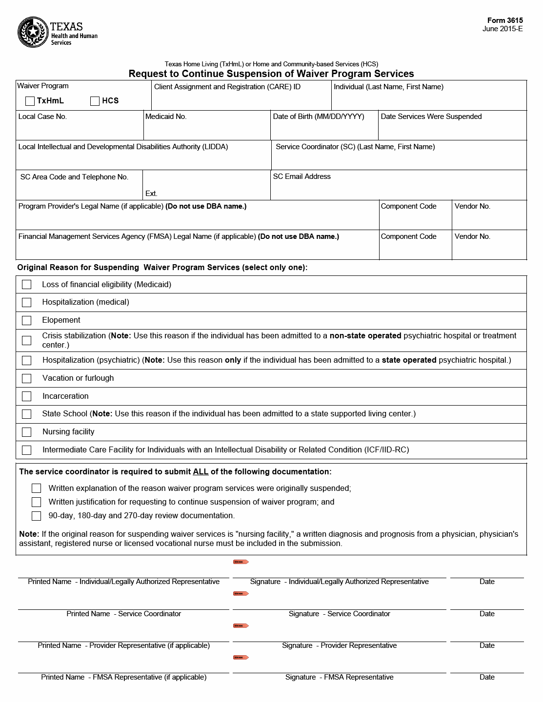 TX HHS Form 3615. Request to Continue Suspension of Waiver Program Services