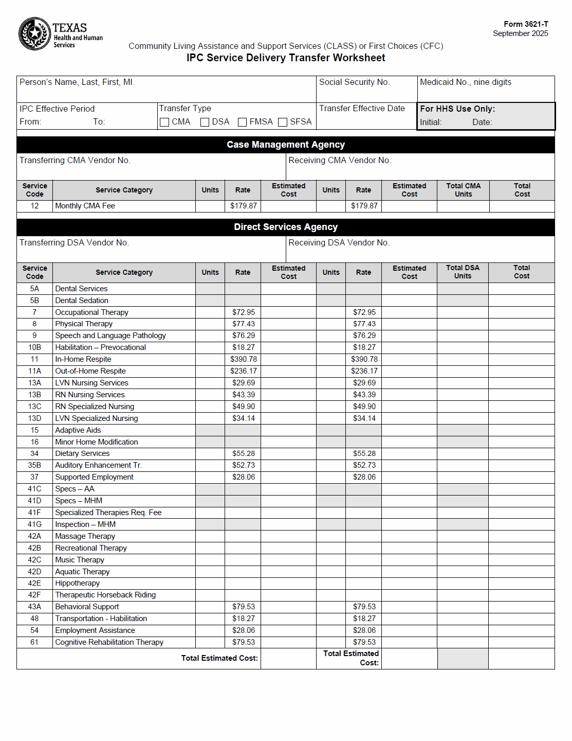 TX HHS Form 3621-T. CLASS and CFC IPC Service Delivery Transfer Worksheet