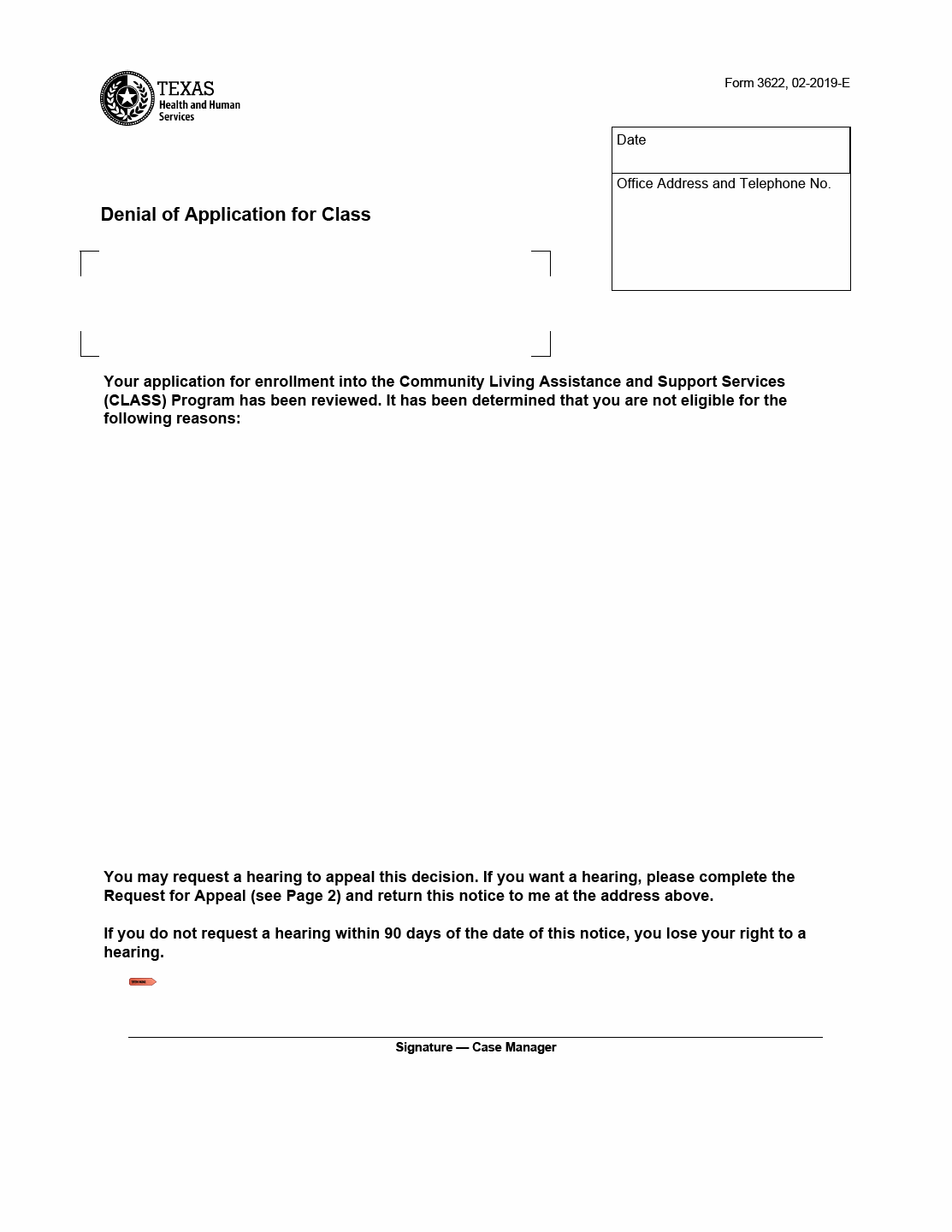 The TX HHS Form 3622, "Denial of Application for CLASS," is a crucial document used to notify an applicant that their application for enrollment into the Community Living Assistance and Support Services (CLASS) Program has been denied. This form outlines the reasons for denial and provides the applicant with the opportunity to appeal the decision.