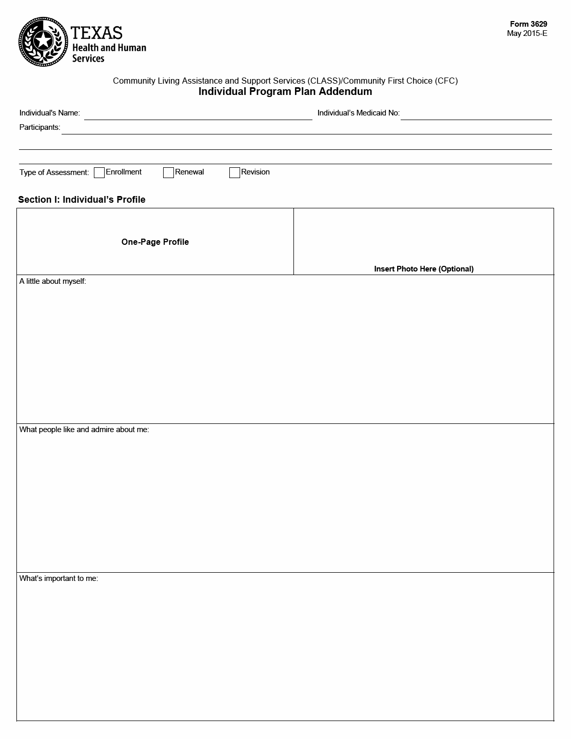 The addendum requires the individual's name, Medicaid number, and type of assessment (enrollment, renewal, or revision). It also includes a section for the individual to provide a one-page profile, which can include a photo. This profile serves as an opportunity for the individual to share what they like and admire about themselves, providing a personal touch to their program plan.