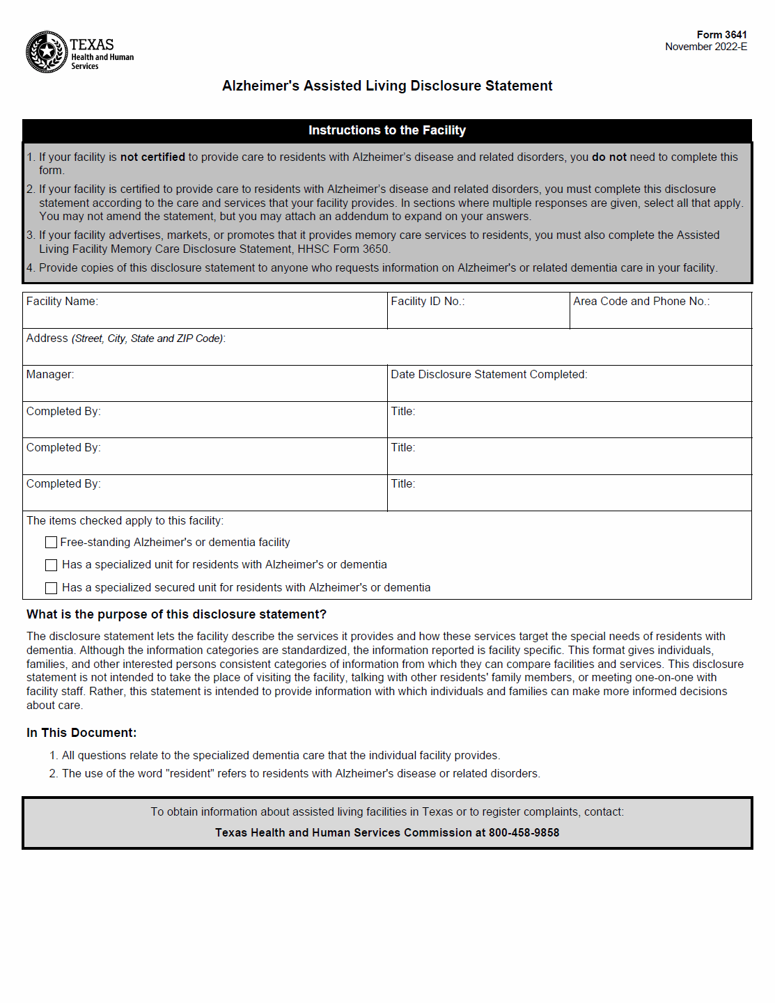 TX HHS Form 3641. Alzheimer's Assisted Living Disclosure Statement