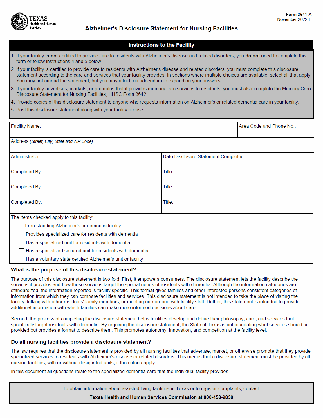 TX HHS Form 3641-A. Alzheimer's Disclosure Statement for Nursing Facilities