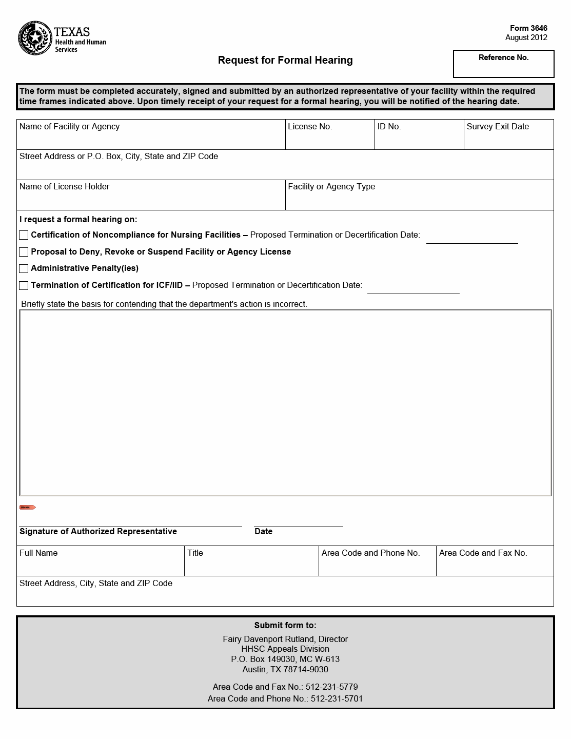 The TX HHS Form 3646, Request for Formal Hearing, is a crucial document used to initiate a formal hearing process when an individual or organization disagrees with a decision made by the Texas Health and Human Services (HHS) regarding the certification of a nursing facility or the termination/suspension of a facility or agency license. This form must be completed accurately, signed, and submitted within specific timeframes.