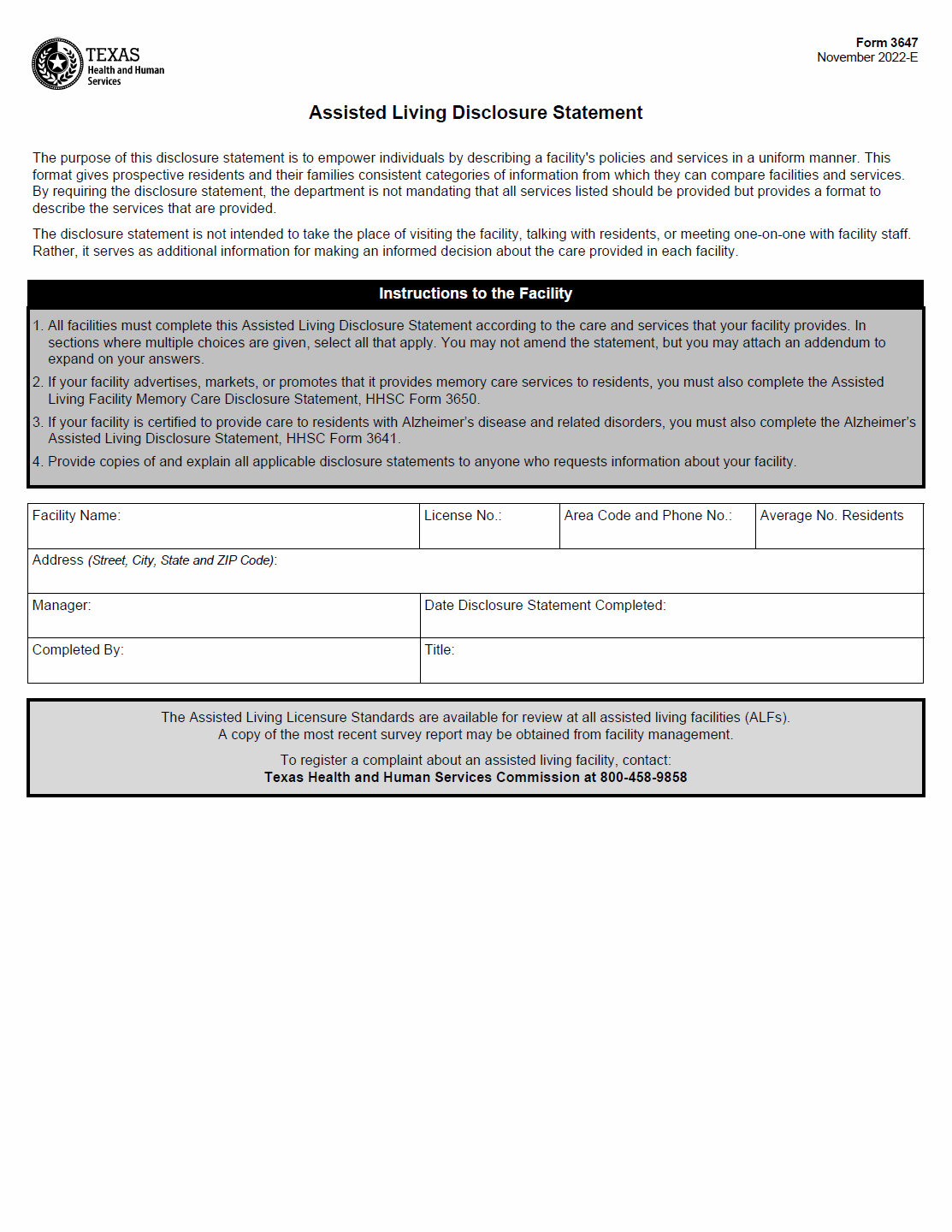 TX HHS Form 3647. Assisted Living Disclosure Statement