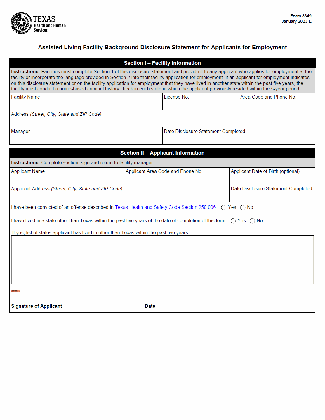 TX HHS Form 3649. Assisted Living Facility Background Disclosure Statement for Applicants for Employment