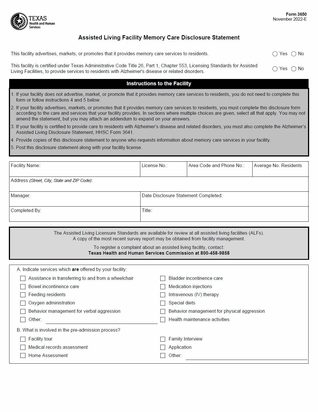 TX HHS Form 3650. Assisted Living Facility Memory Care Disclosure Statement