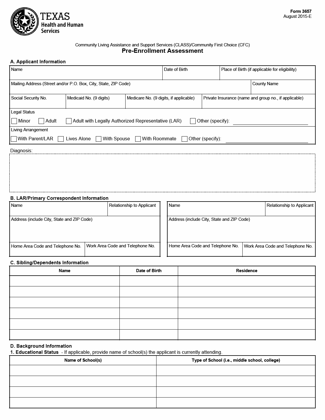 TX HHS Form 3657. Pre-Enrollment Assessment