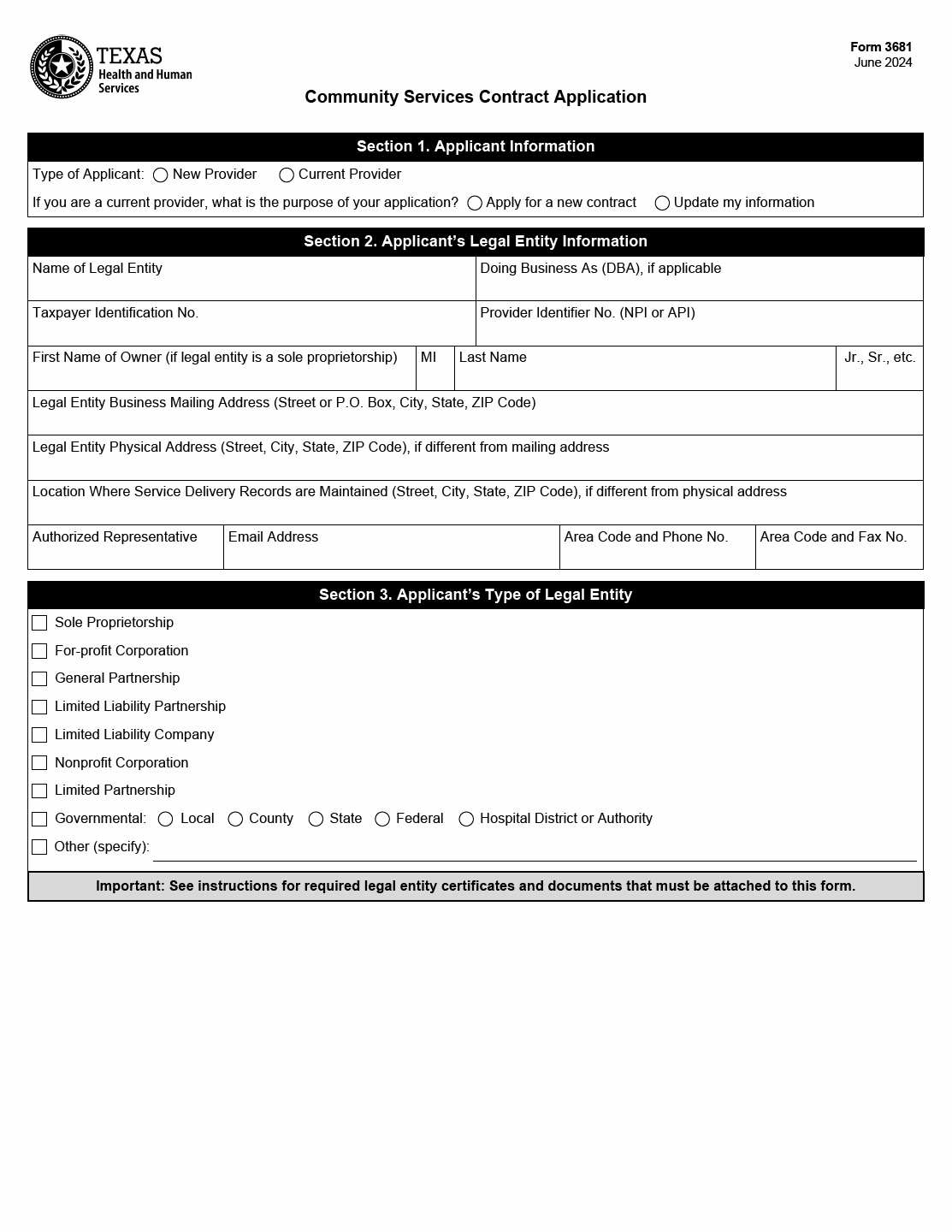 This form should be used by organizations seeking to provide community services in Texas, including new providers applying for a contract or current providers looking to update their information. By completing this application, applicants can ensure they have the necessary documentation to move forward with their service delivery plans. (TX HHS Form 3681: Community Services Contract Application)