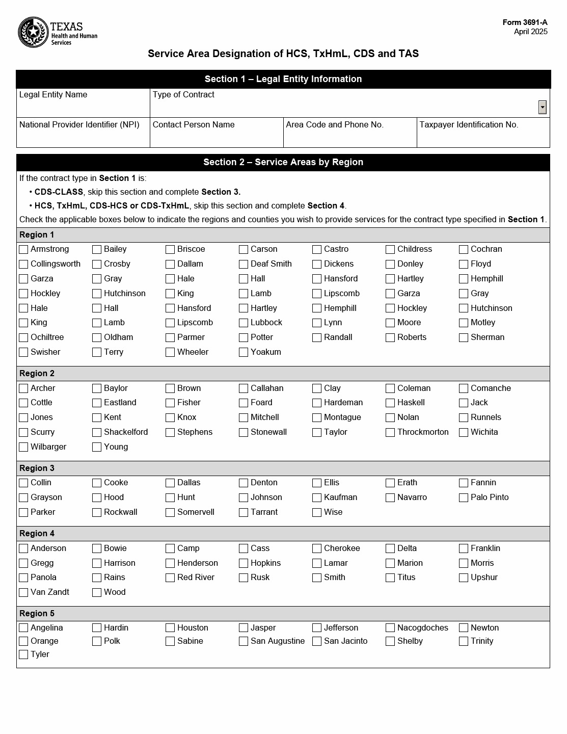 TX HHS Form 3691-A. Service Area Designation HCS. TxHmL. CDS and TAS