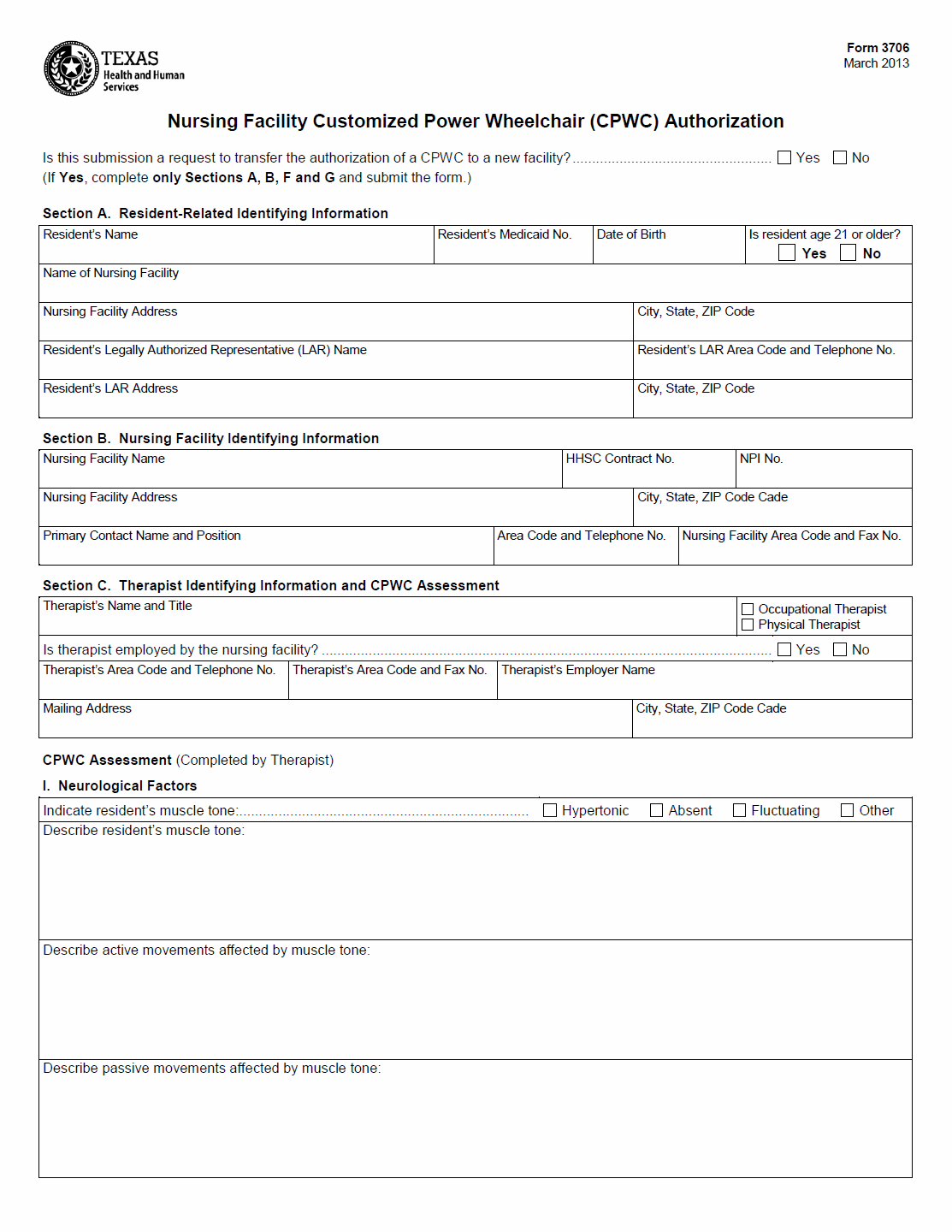 TX HHS Form 3706. Nursing Facility Customized Power Wheelchair (CPWC) Authorization