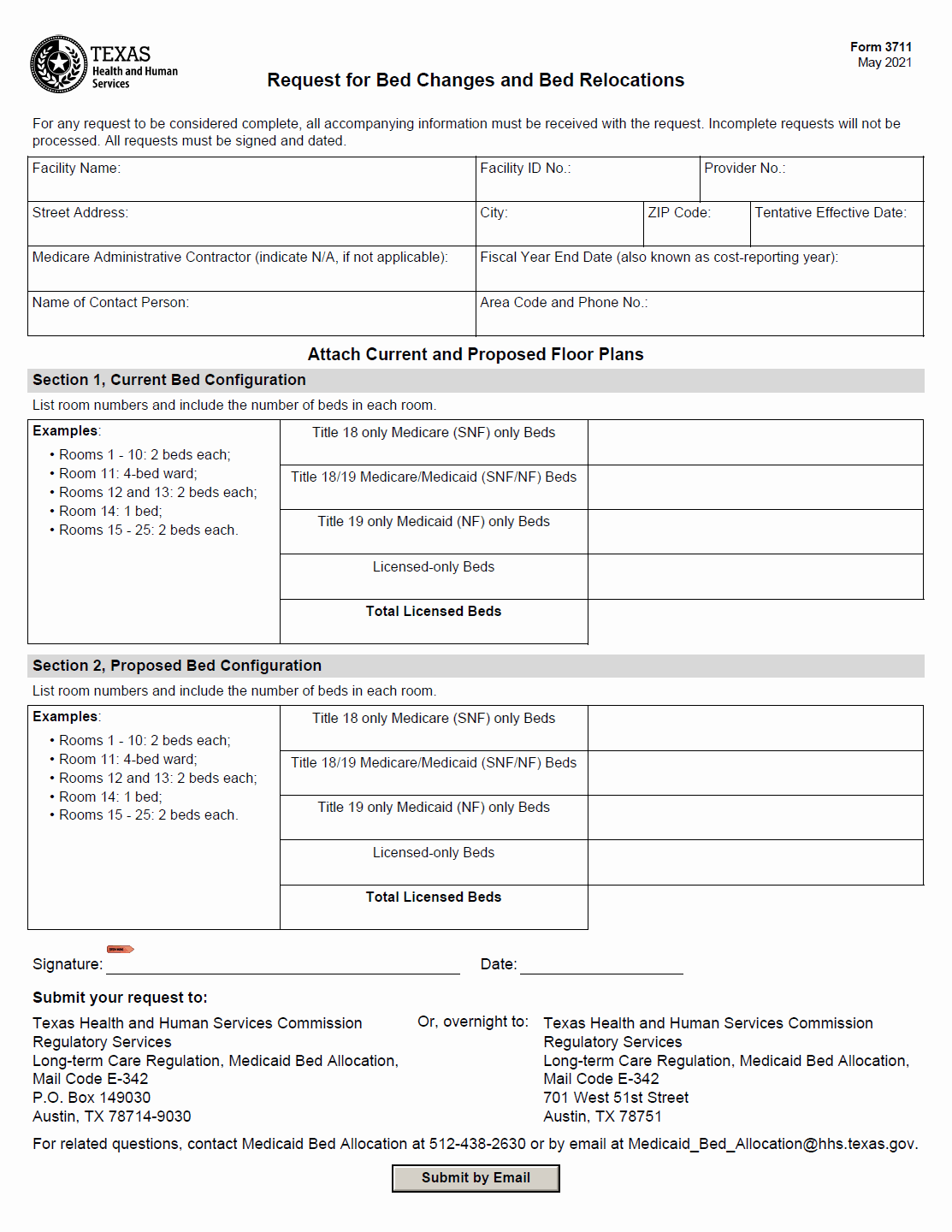 The TX HHS Form 3711 should be submitted to the Texas Health and Human Services Commission, either by mail or email, along with any accompanying information. For related questions or concerns, contact Medicaid Bed Allocation at 512-438-2630 or via email at [email protected].