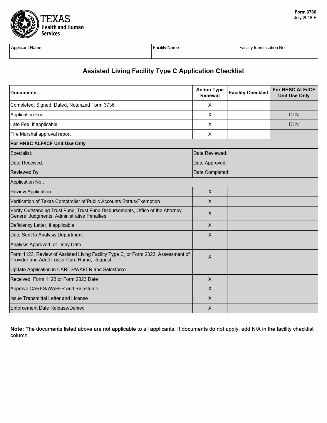 TX HHS Form 3736. Application for State License to Operate a Type C Assisted Living Facility