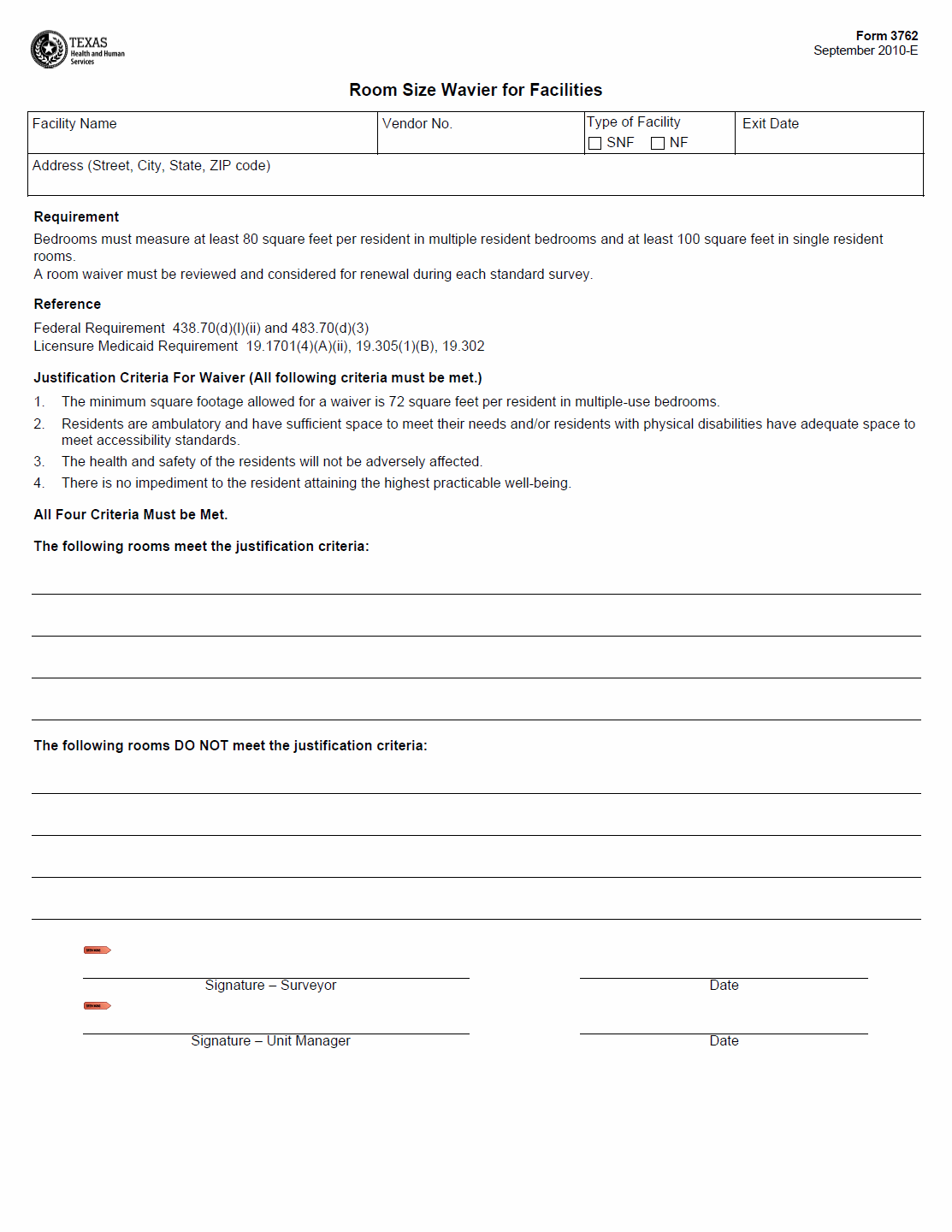 The TX HHS Form 3762, "Room Size Variance", is a crucial document used to request a waiver from the standard room size requirements for facilities. This form helps solve the problem of non-compliance with minimum square footage per resident in multiple or single resident rooms.