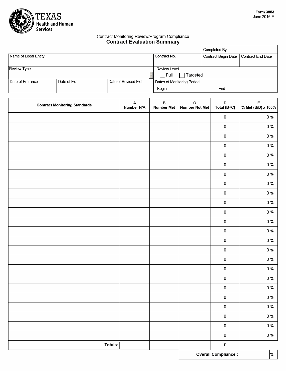 TX HHS Form 3853. Contract Evaluation Summary