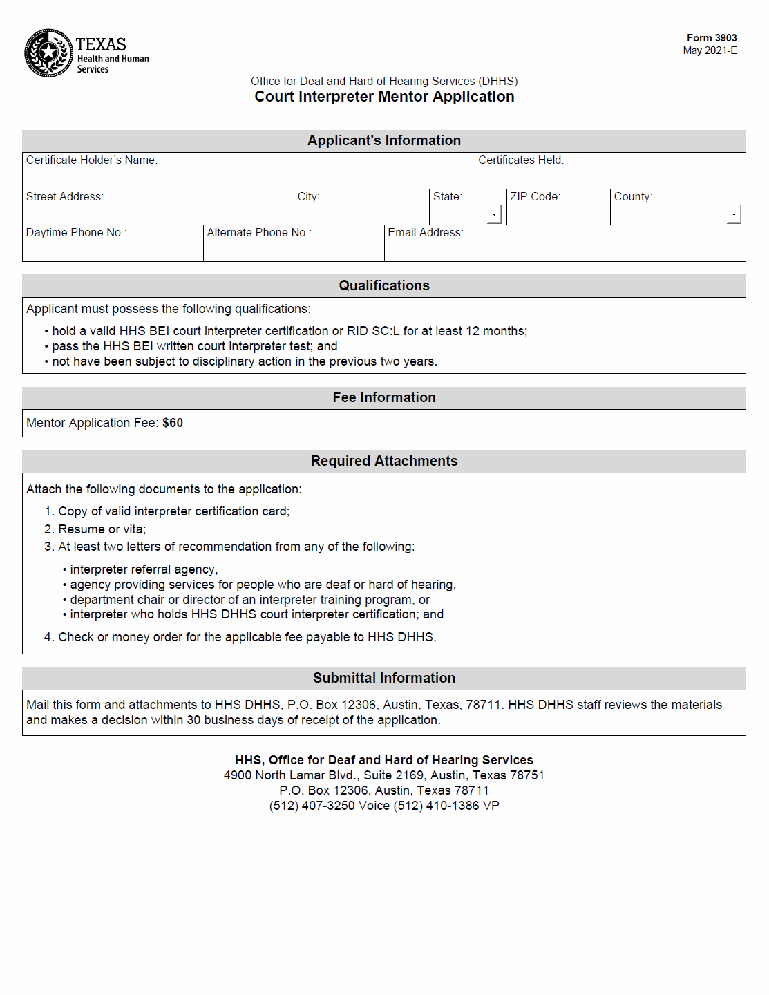 TX HHS Form 3903. Court Interpreter Mentor Application