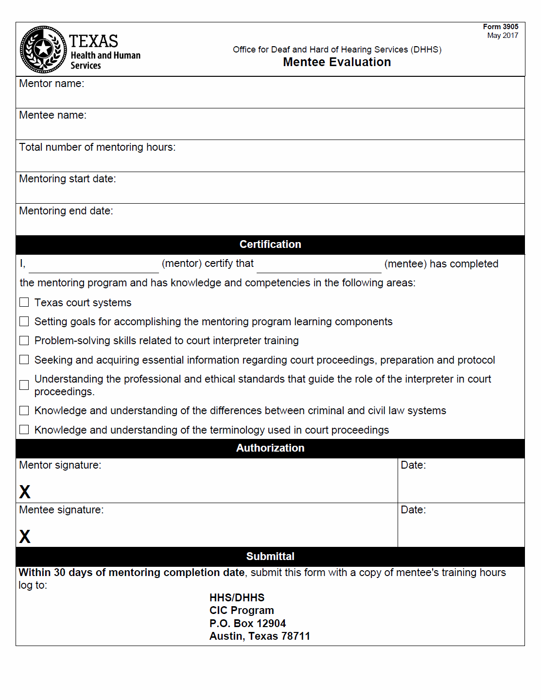 This form is intended for use by mentors who have completed a mentoring program in court interpretation and need to evaluate their mentees' progress. The TX HHS Form 3905, Mentee Evaluation, should be used within 30 days of mentoring completion, as specified on the form. By submitting this evaluation, mentors can provide valuable feedback to their mentees and contribute to the overall success of the mentoring program.