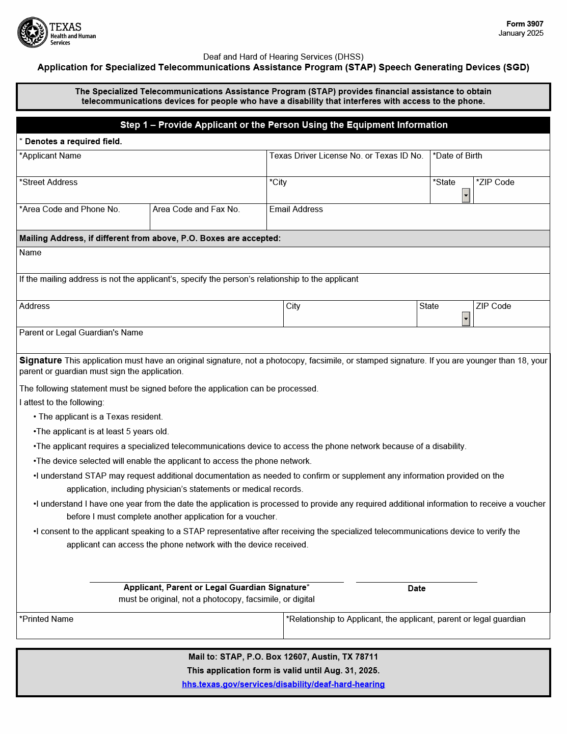 The STAP program provides financial assistance for specialized telecommunications devices, including speech generating devices (SGD). This application is valid until August 31, 2025, and should be mailed to STAP at P.O. Box 12607, Austin, TX 78711. The applicant must understand that additional documentation may be requested to confirm or supplement the information provided on the application.