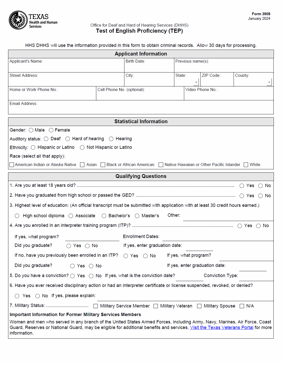 The TX HHS Form 3908 should be used when individuals need to demonstrate their English proficiency or provide information related to their education, training, or criminal history. Processing time is approximately 30 days. It's essential for applicants to carefully complete the form, as it may affect their eligibility for certain benefits and services.