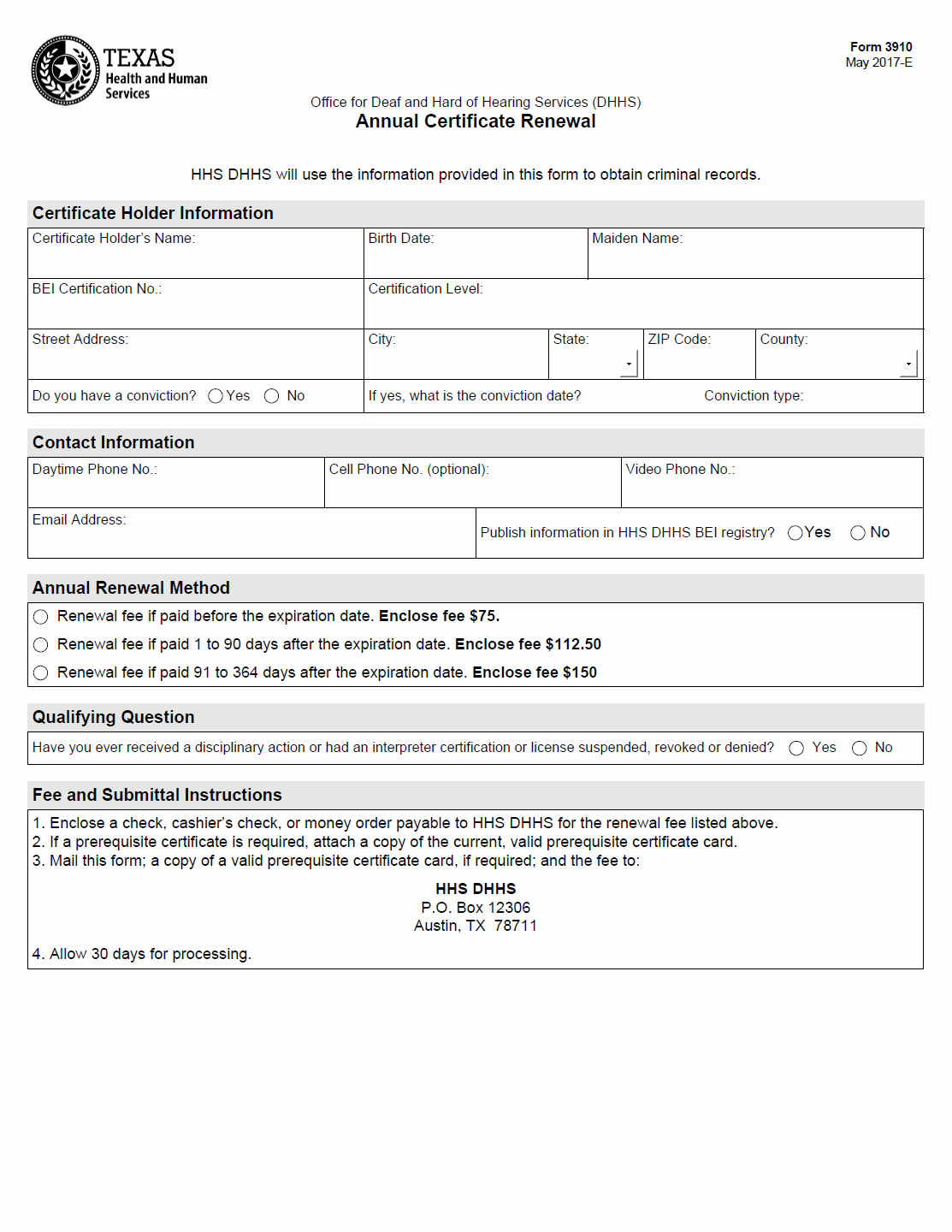 The TX HHS Form 3910, Annual Certificate Renewal, is a crucial document for individuals who need to renew their certification as an interpreter for the deaf and hard of hearing. This form helps solve the problem of maintaining current certification status by providing a means to update information and pay renewal fees.