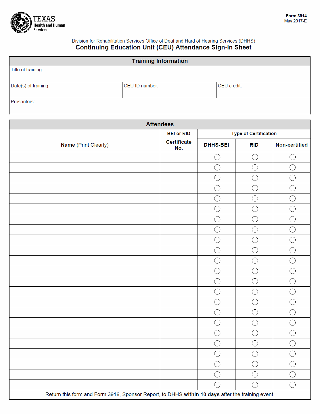 TX HHS Form 3914. Continuing Education Unit (CEU) Attendance Sign-in Sheet