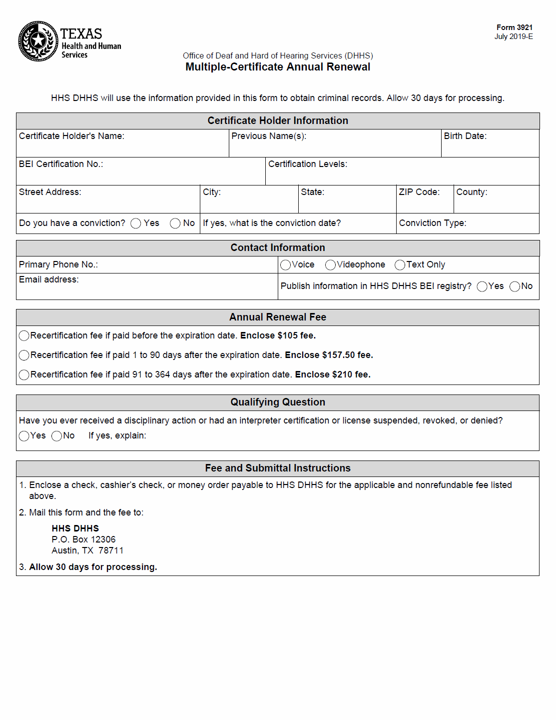 The Multiple-Certificate Annual Renewal Form 3921 should be used by individuals who need to renew their certifications or licenses annually. It is essential to allow 30 days for processing, as stated in the form. Failure to comply with this timeframe may result in additional fees or penalties. The form can be submitted via mail to HHS DHHS at P.O. Box 12306 Austin, TX 78711, along with the required fee.