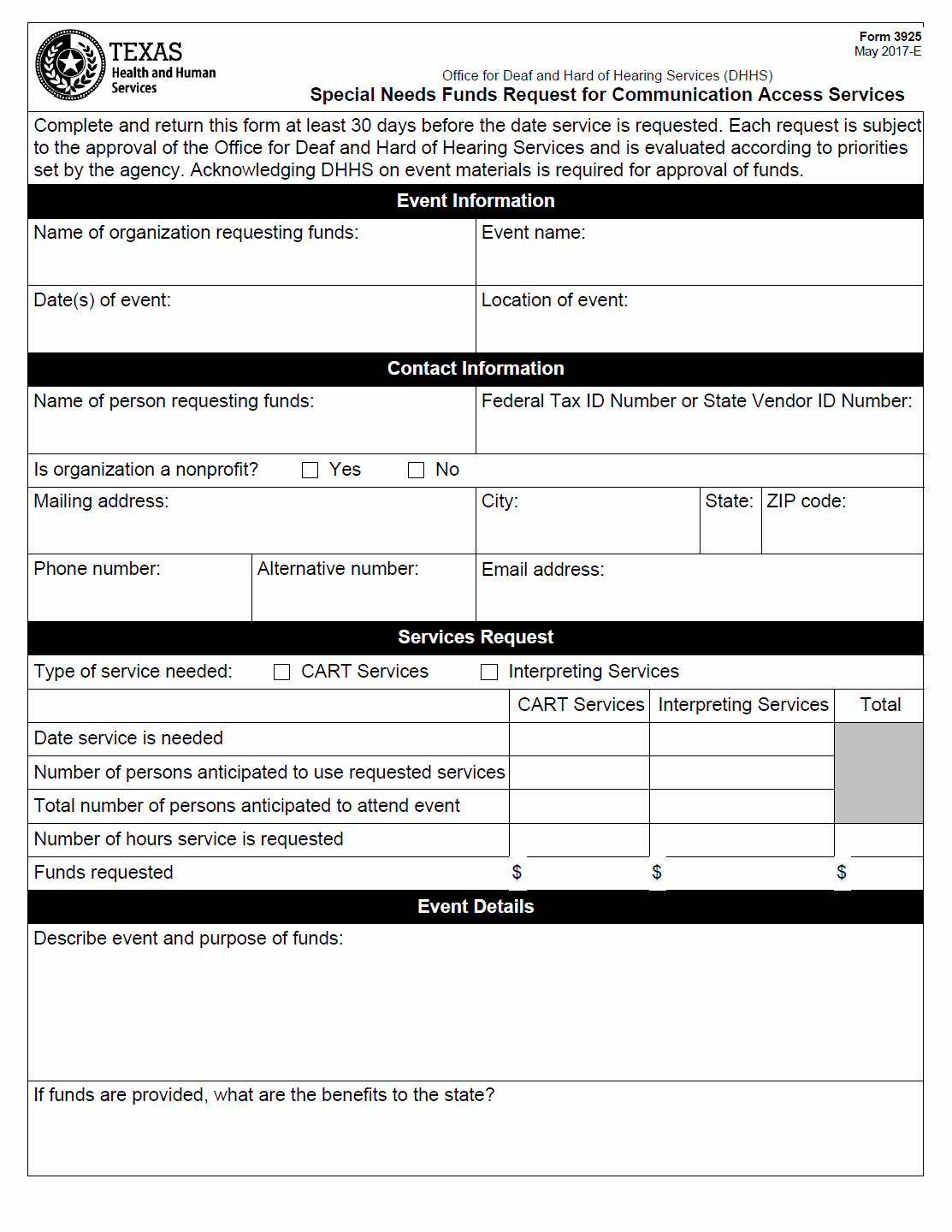 TX HHS Form 3925. Special Needs Funds Request for Communication Access
