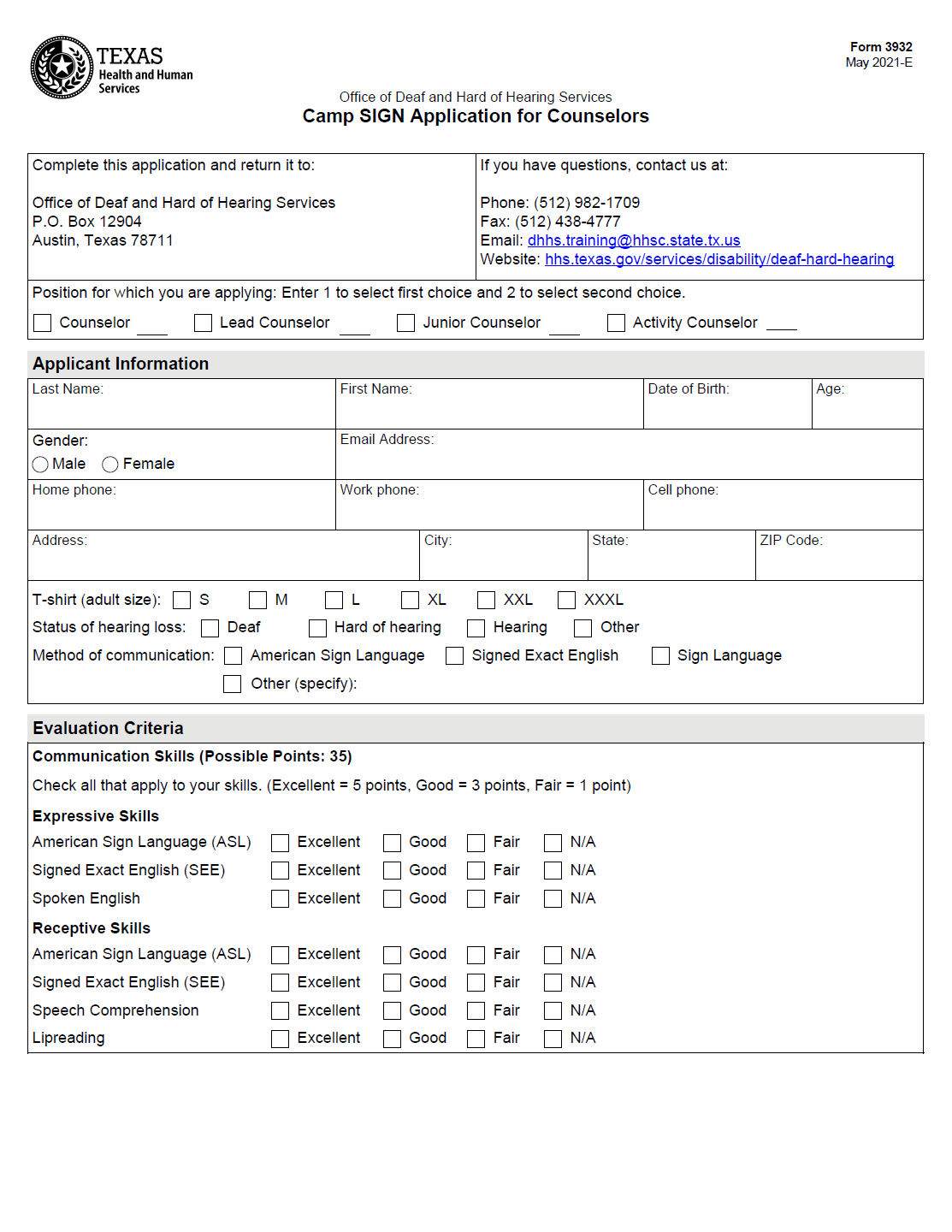 TX HHS Form 3932. Camp SIGN Application for Counselors