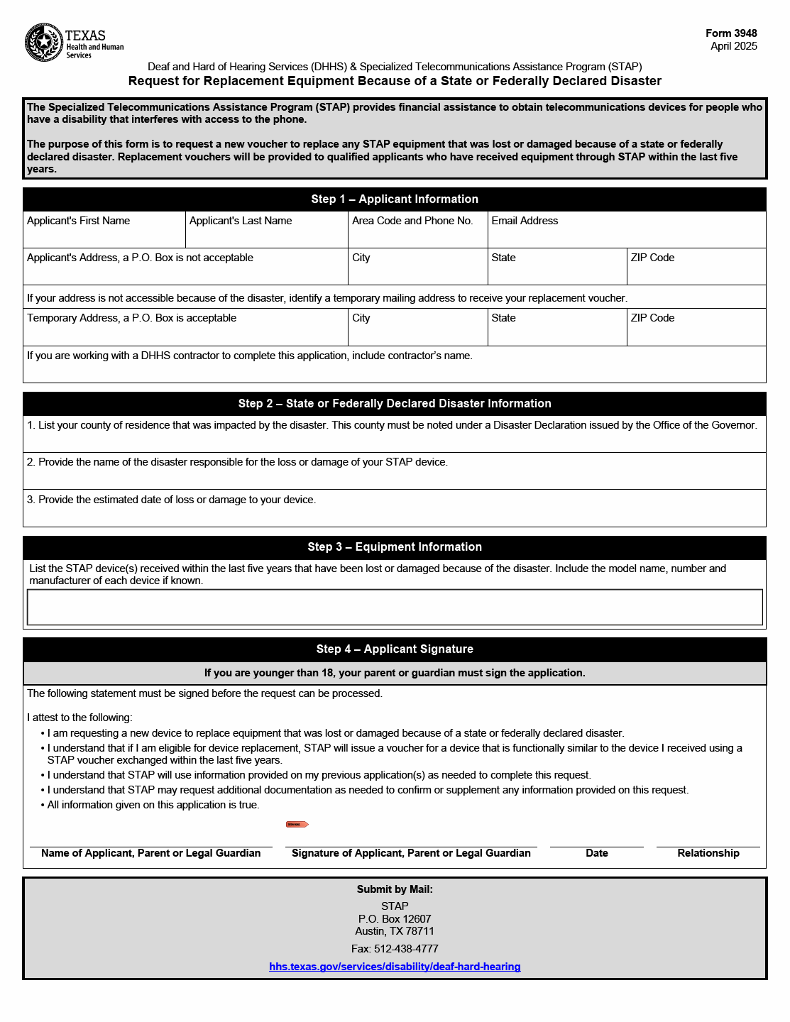 TX HHS Form 3948. DHHS & STAP Request for Replacement Equipment Because of a State or Federally Declared Disaster