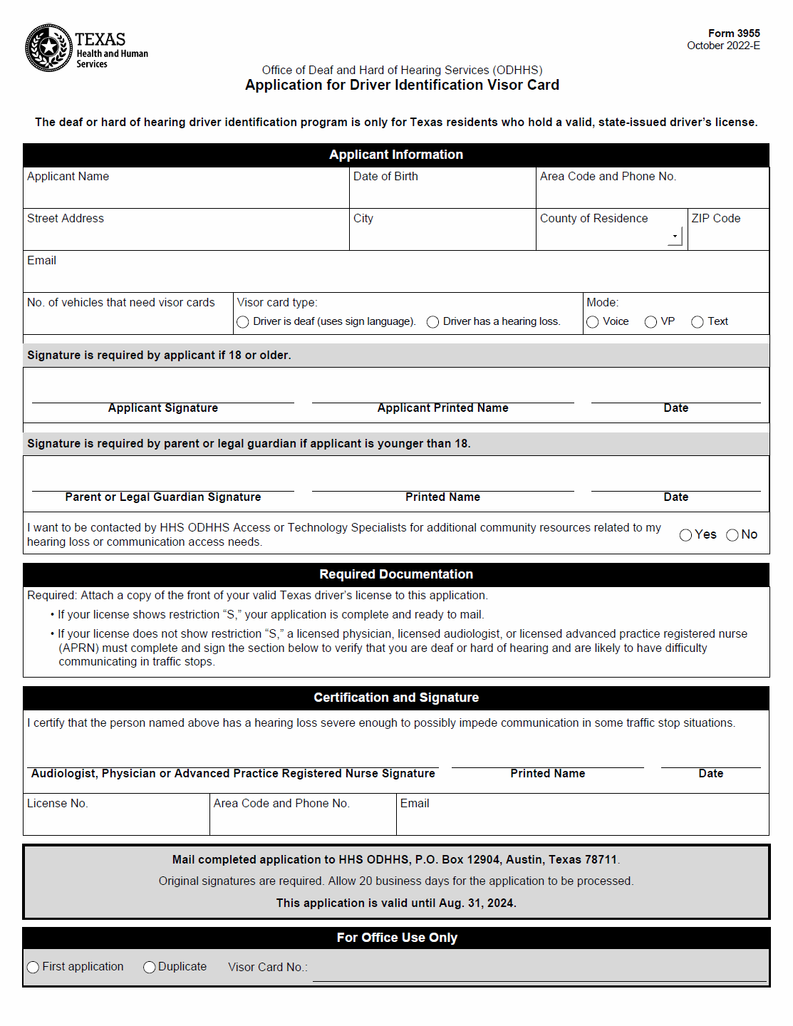 To complete the application, applicants must attach a copy of their valid Texas driver's license and provide certification from a licensed physician, audiologist, or advanced practice registered nurse verifying that they are deaf or hard of hearing and likely to have difficulty communicating in traffic stops. The form is valid until August 31, 2024, and should be mailed to HHS ODHHS at P.O. Box 12904, Austin, Texas 78711.