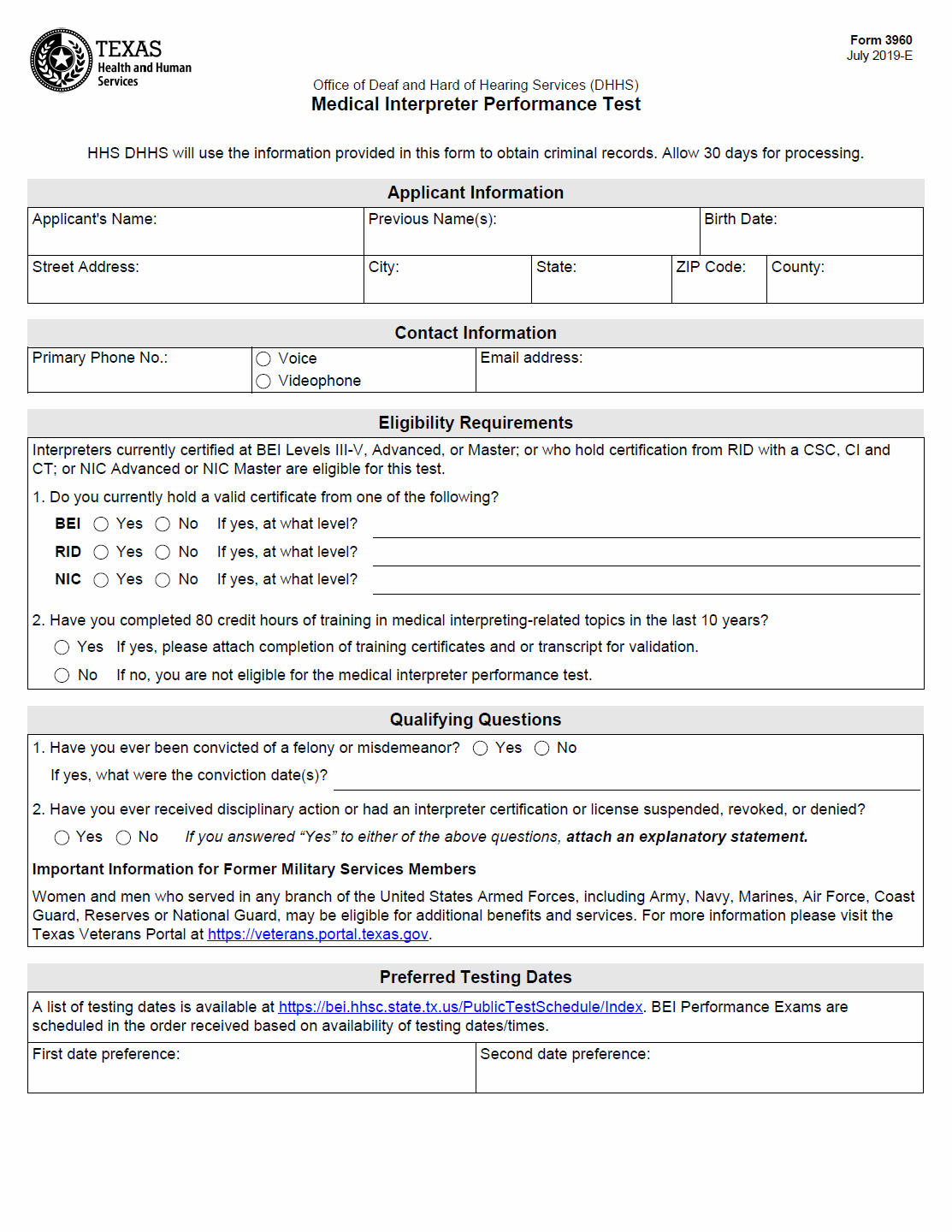 TX HHS Form 3960. Medical Interpreter Performance Test