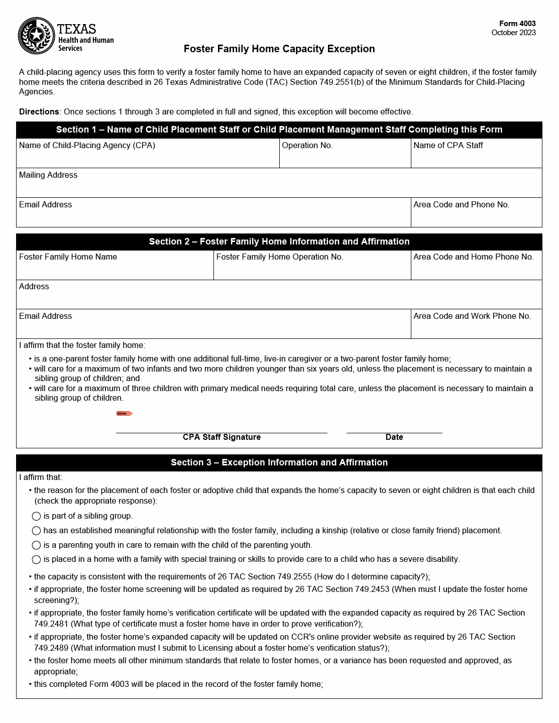 TX HHS Form 4003. Foster Family Home Capacity Exception