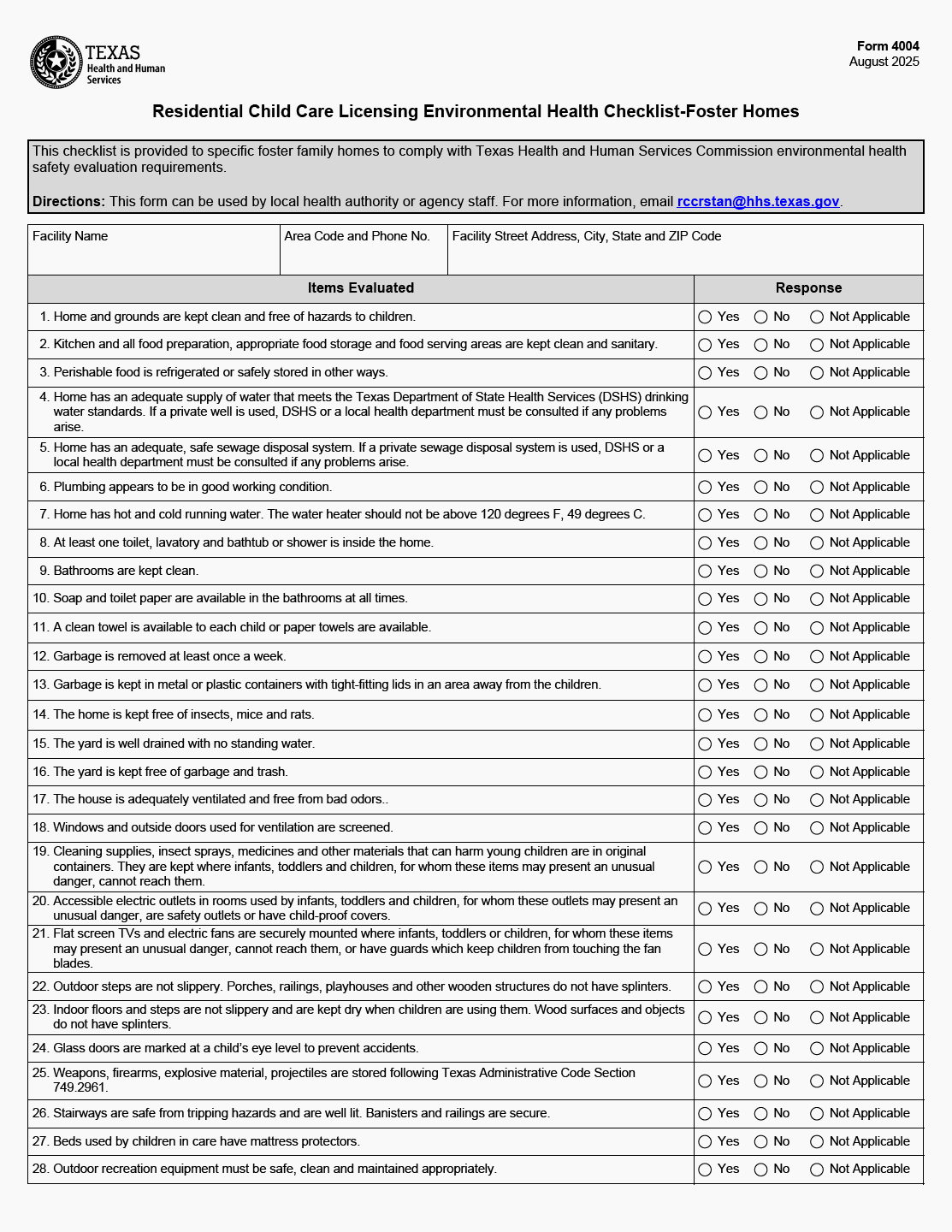 TX HHS Form 4004. Residential Child Care Licensing Environment Health Checklist