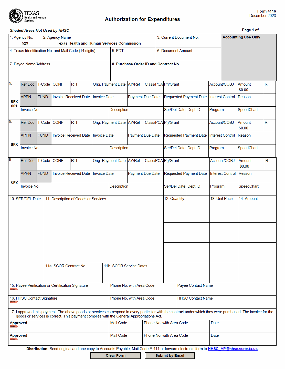 TX HHS Form 4116, "Authorization for Expenditures," is a crucial document used to authorize payments for goods or services. This form helps solve the problem of ensuring that expenditures are properly approved and comply with relevant regulations.