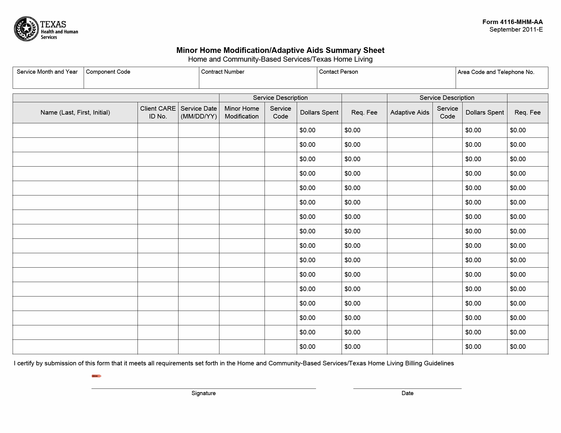TX HHS Form 4116-MHM-AA. Minor Home Modification and Adaptive Aids Summary Sheet