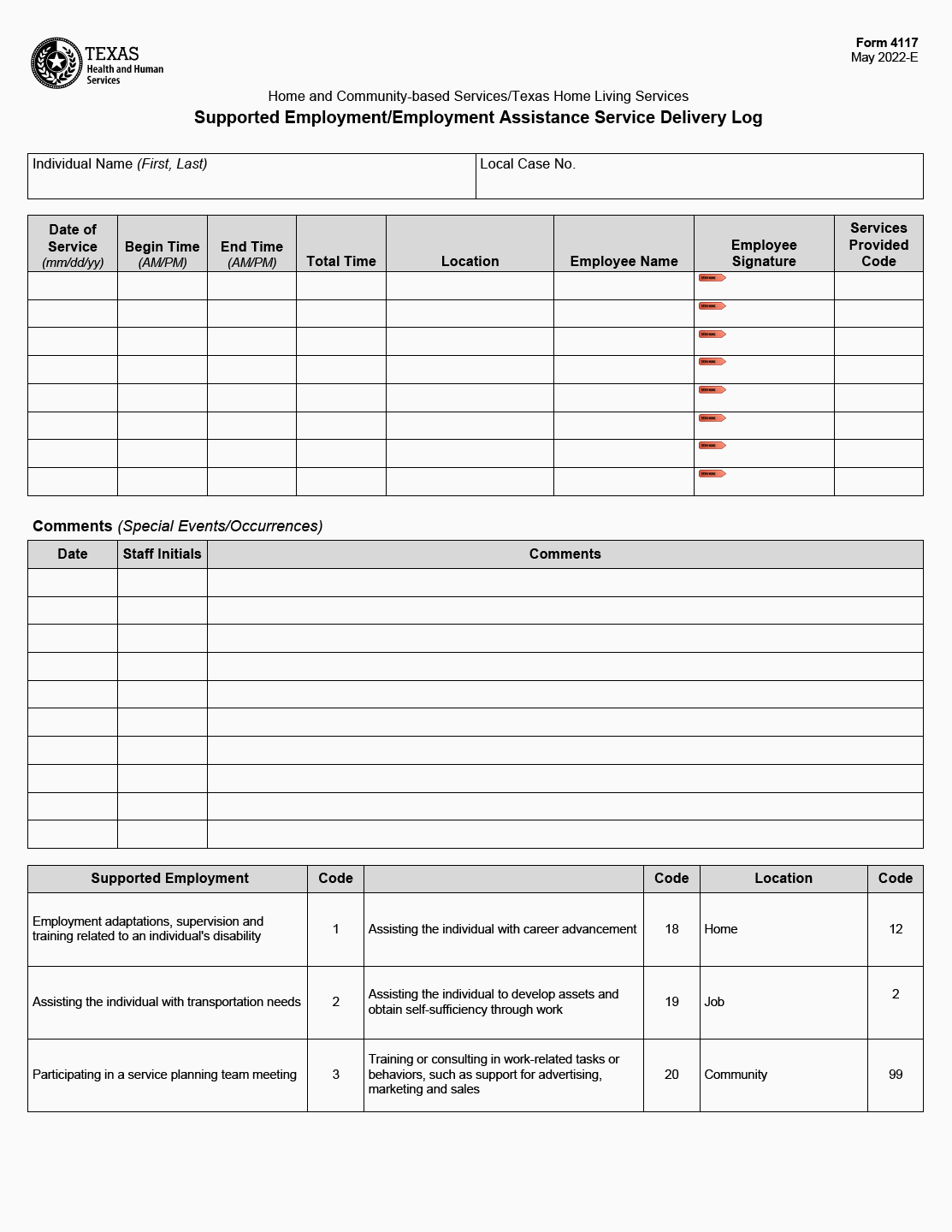 TX HHS Form 4117. Supported Employment/Employment Assistance Service Delivery Log