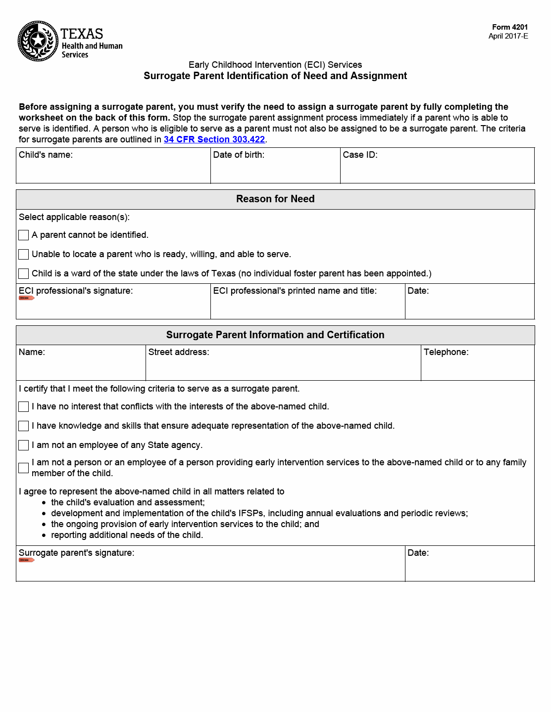 TX HHS Form 4201. ECI Surrogate Parent Identification of Need and Assignment