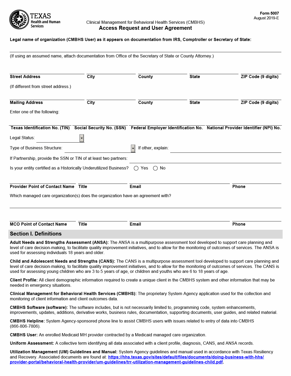 TX HHS Form 5007. CMBHS Access Request and User Agreement