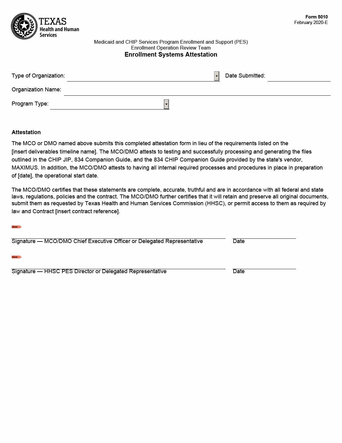 The TX HHS Form 5010, Enrollment Systems Attestation, is a crucial document used to attest to the testing and successful processing of files outlined in the CHIP JIP, 834 Companion Guide, and the 834 CHIP Companion Guide. This form helps ensure that Managed Care Organizations (MCOs) or Designated Medicaid Organizations (DMOs) have all internal processes and procedures in place for operational start dates.
