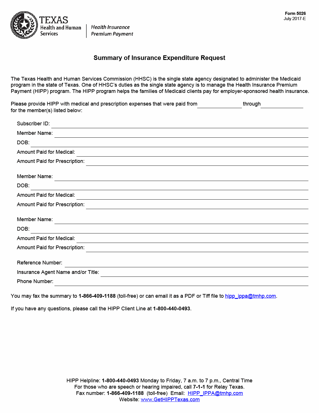 TX HHS Form 5026. HIPP Summary of Insurance Expenditure Request