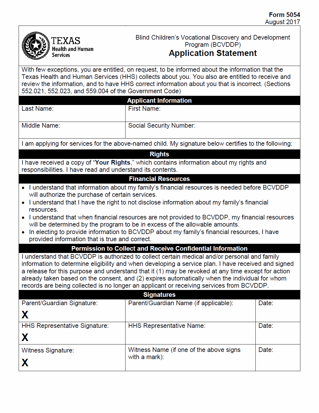 The TX HHS Form 5054 Application Statement is an essential tool for parents seeking support for their blind children. By understanding the required information, important sections, and common scenarios of use, applicants can successfully navigate the application process and secure the necessary services for their child's development and growth.