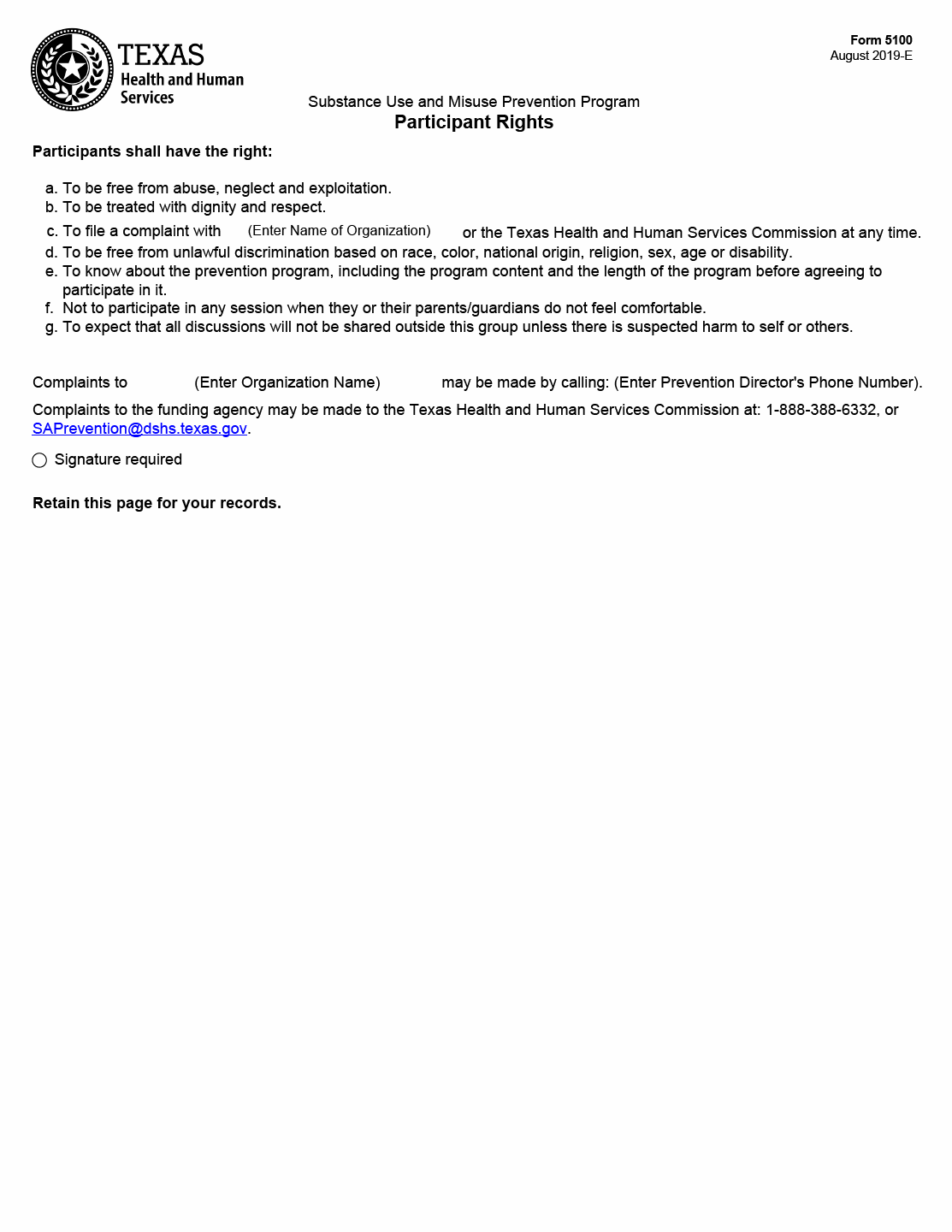 The TX HHS Form 5100, Participant Rights, should be used when participants are entering a Substance Use and Misuse Prevention Program. This document provides essential information for participants and helps ensure their rights are respected throughout the program. By retaining this page for records, participants can easily access their rights and take advantage of the complaint process if needed.