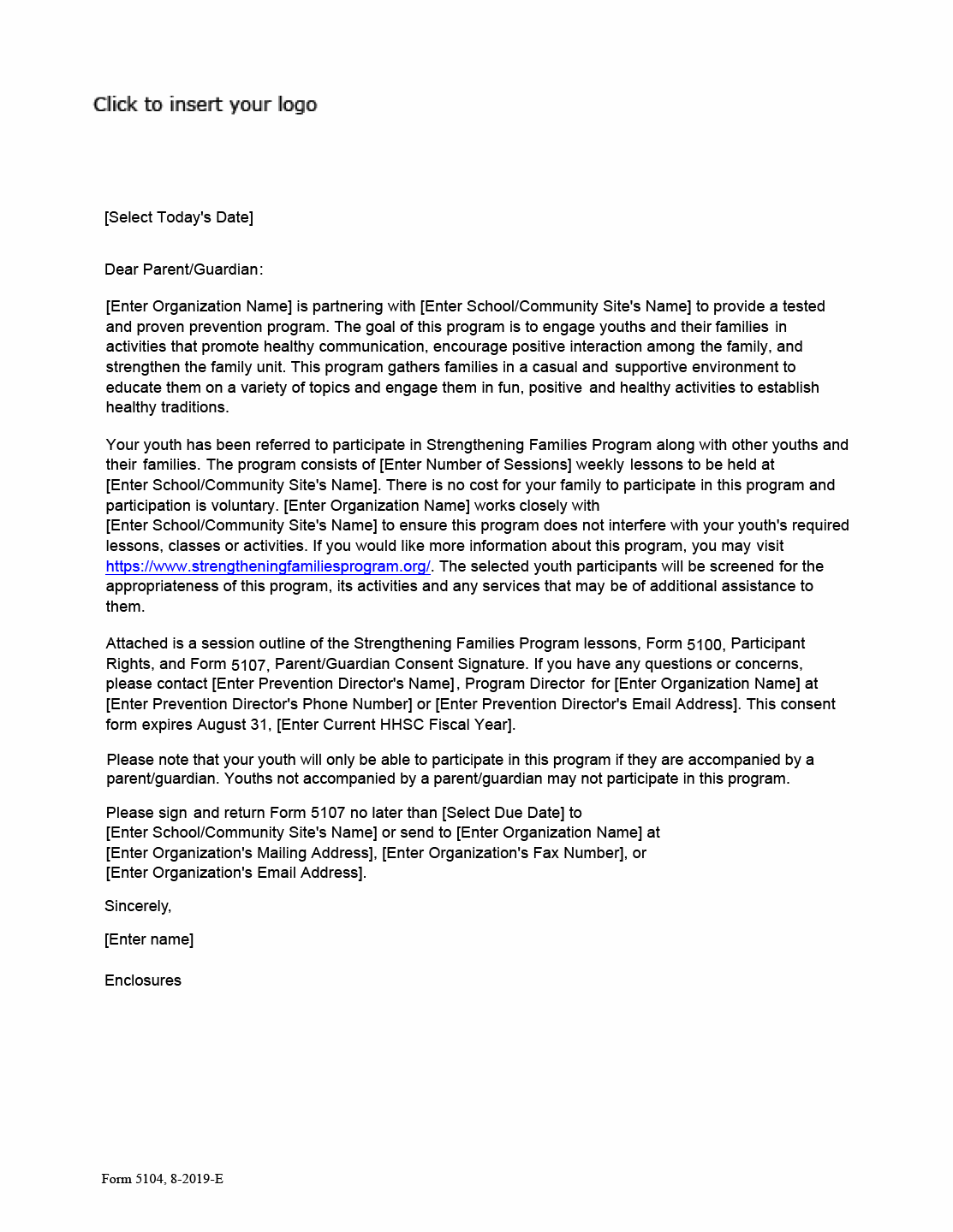The TX HHS Form 5104, Youth Prevention Indicated Family Focused Program Participation Letter, is a document used to inform parents or guardians about the Strengthening Families Program, a tested and proven prevention program designed to engage youths and their families in activities promoting healthy communication and family unity. This form is typically used when a youth has been referred to participate in the program along with other youths and their families.