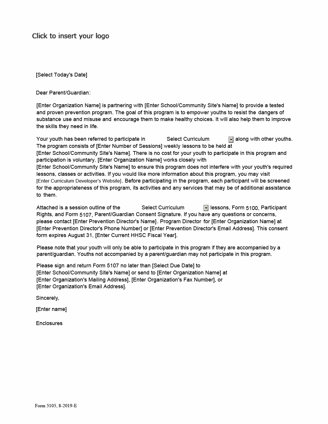 TX HHS Form 5105. Youth Prevention Indicated Program Participation Letter